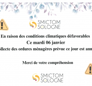 La collecte du mardi 06 janvier ayant été annulée suite aux conditions météorologiques, la prochaine collecte aura lieu le mardi 20 janvier. Exceptionnellement, les sacs présentés sur le bac ou à côté seront collectés.
